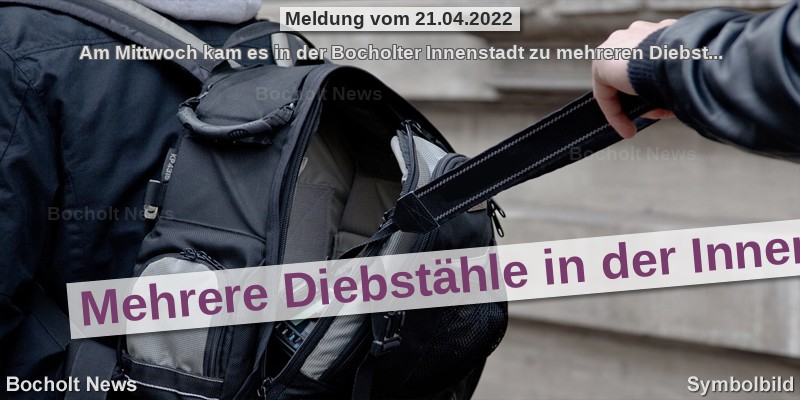 Am Mittwoch kam es in der Bocholter Innenstadt zu mehreren Diebstählen:re> - Ca. 16.50 Uhr, Drogeriegeschäft an der Osterstraße; zwei weibliche unbekannte Tatverdächtige; ca. 30 - 35 Jahre alt, ca. 170 bzw. 175 cm groß, dunkelhaarig. Eine bekleidet mit einem dunklen Jumpsuit, die andere mit einem weißen T-Shirt und schwarzer Dreiviertelhose. - Ca. 15.30 Uhr, Welfenstraße, Bekleidungsgeschäft, Diebstahl eines Mobiltelefons; Täterbeschreibung: Ca. 30 Jahre alte Frau, ca. 170 cm groß, schwarze lange zum Zopf gebundene Haare, augenscheinlichsüdosteuropäischer Herkunft, bekleidet mit Jeanshose, blauem Oberteilund schwarzen Schuhen mit auffällig goldfarbenen Reißverschlüssen.