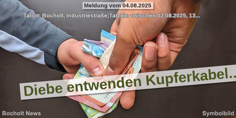 Tatort: Bocholt, Industriestraße;Tatzeit: zwischen 02.08.2025, 13.00 Uhr, und 04.08.2025, 06.10 Uhr;Kupferkabel aus einem Rohbau entwendeten bislang unbekannte Täter an der Industriestraße in Bocholt. Das Geschehen spielte sich zwischen Samstagmittag und Montagmorgen ab.Die Polizei sucht Zeugen. Hinweise nimmt das Kriminalkommissariat in Bocholt unter Tel. (02871) 2990 entgegen. (sb)