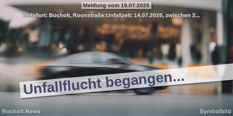 Unfallort: Bocholt, Roonstraße;Unfallzeit: 14.07.2025, zwischen 21.30 Uhr und 21.50 Uhr;Einen schwarzen Opel Corsa angefahren hat ein bislang unbekannter Verkehrsteilnehmer in Bocholt. Das Auto stand auf dem Parkplatz eines Supermarktes in der Roonstraße. Montagabend, zwischen 21.30 Uhr und 21.50 Uhr beschädigte der Flüchtige das Fahrzeug auf der linken Seite und entfernte sich, ohne seinen gesetzlichen Pflichten nachgekommen zu sein. Der Sachschaden wird auf 3.000 Euro geschätzt.Die Polizei bittet Zeugen, sich beim Verkehrskommissariat in Bocholt (Telefon 02871 / 299-0) zu melden. (ts) |