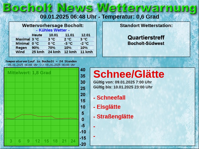Es besteht die Möglichkeit, dass das gemeldete Wetterereignis eintritt. Deshalb wird eine Warnung heraus gegeben. Es kann auch sein, dass das Wetterereignis schwächer, stärker oder nicht eintritt. Speziell bei Gewitterwetterlagen sind die Unwetterereignisse örtlich eng begrenzt. Bei Gewittern z.B. kann es vorkommen, daß in Rhede die Straßen überschwemmt sind, während in Bocholt die Sonne scheint.