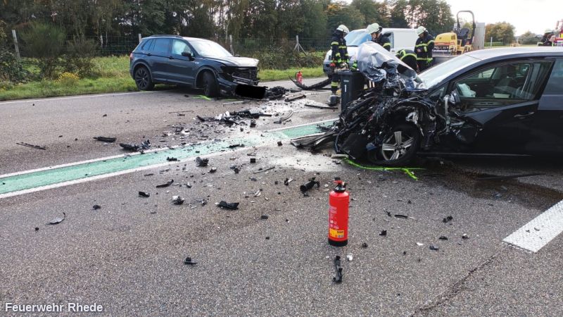 Die Feuerwehr Rhede übernahm die Absicherung der Einsatzstelle, stellte den Brandschutz sicher und klemmte die Fahrzeugbatterien ab. Zur technischen Hilfeleistung kam ein hydraulischer Spreizer zum Einsatz.