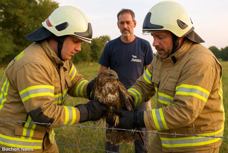 Am späten Nachmittag wurde die Einheit Brünen mit dem Einsatzstichwort „Tier in Not“ zum Eimersweg alarmiert. Vor Ort fanden die Einsatzkräfte einen Bussard, der sich im Stacheldrahtzaun verfangen hatte.