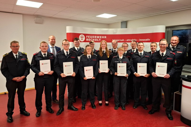 Zum Abschluss des offiziellen Teils sprach Feuerwehrleiter Dirk Arping zusammen mit seinen Stellvertretern Jörg Telaar und Marco Heisterkamp zahlreiche Beförderungen aus. So wurden Tom Benning, Chris Franke und Justin van Gelder zu Feuerwehrmännern ernannt. Kira van Marwick erhielt die Beförderung zur Oberfeuerwehrfrau. Zu Unterbrandmeistern wurden Philipp Dekkers, Martin Jansen, Tobias Siecksmeier, Jan te Strote, Chantal Tielmann und Max Uebbing befördert. Luke Westermann stieg in den Rang des Oberbrandmeisters auf. Mit der Beförderung von Luisa Schumacher zur Brandoberinspektorin wurde schließlich eine weitere wichtige Führungsposition gestärkt.