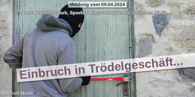 Tatort: Bocholt-Spork, Sporker Ringstraße;Tatzeit: zwischen 29.03.2024, 17.00 Uhr, und 08.04.2024, 15.00 Uhr;Eine geringe Menge Bargeld in deutscher sowie ausländischer Währung und zwei Modelleisenbahnen haben Unbekannte bei einem Einbruch in Bocholt-Spork erbeutet. Um in das Geschäft für Trödelartikel zu gelangen, schlugen die Täter zwischen Karfreitag, 17.00 Uhr, und vergangenen Montag, 15.00 Uhr, ein Toilettenfenster ein. Die Polizei sucht Zeugen. Hinweise bitte an die Kripo Bocholt: Tel. (02871) 2990. (db)