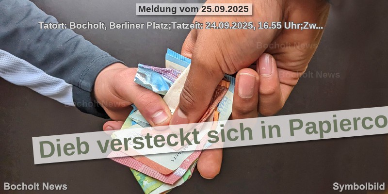 Tatort: Bocholt, Berliner Platz;Tatzeit: 24.09.2025, 16.55 Uhr;Zwei Tatverdächtige gefasst hat die Polizei nach dem Diebstahl dreier Mobiltelefone in Bocholt. Am Mittwoch betraten die beiden Jugendlichen die Verkaufsräume eines Geschäftes im Einkaufszentrum Arkaden. Einer der beiden riss drei Mobiltelefone aus der Auslage und das Duo flüchtete aus dem Geschäft. Eine Zeugin alarmierte die Polizei und übermittelte die Beschreibung der Täter. Im Zuge der Fahndung fanden die Polizeibeamten in einem Vorgarten auf einen Jugendlichen, auf den die Beschreibung zutraf. Den zweiten Verdächtigen entdeckten die Polizisten in einem Papiercontainer, den sich dieser als Versteck ausgesucht hatte. Auch die drei gestohlenen Handys fanden sich dort. Es klickten die Handschellen und die Täter wurde zur Polizeiwache gebracht. Nach einer erkennungsdienstlichen Behandlung wurde diese nach Rücksprache mit der Staatsanwaltschaft ihren Erziehungsberechtigten übergeben. Die Jugendlichen erwartet nun ein entsprechendes Strafverfahren. (pl) |