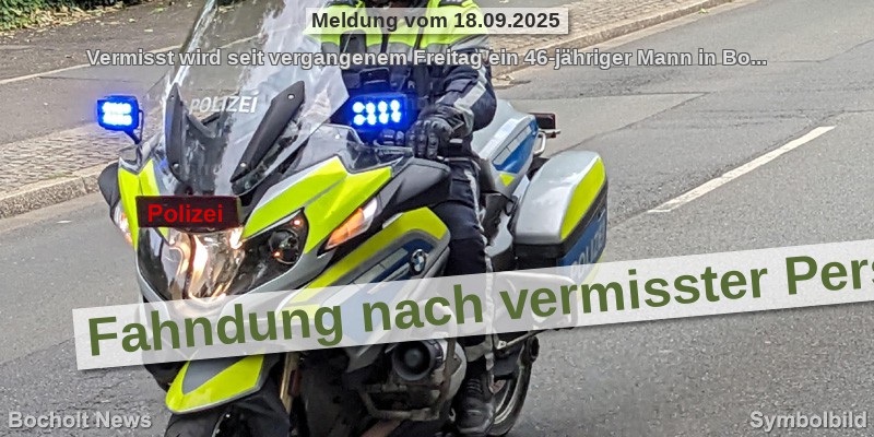 Vermisst wird seit vergangenem Freitag ein 46-jähriger Mann in Bocholt (siehe Foto). Zuletzt hatte er sich im häuslichen Umfeld aufgehalten. Der Vermisste ist etwa 1,85m groß und schlank. Er hat eine graue Kurzhaarfrisur. Möglicherweise befindet sich die Person in hilfloser Lage. Der Vermisste ist vermutlich zu Fuß unterwegs.Die Polizei bittet um Hinweise zum Aufenthaltsort des Mannes über die Notrufnummer 110. (ts)