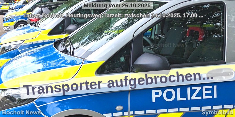 Tatort: Bocholt, Heutingsweg;Tatzeit: zwischen 24.10.2025, 17.00 Uhr und 25.10.2025, 13.00 Uhr;Gartengeräte der Marke Stihl entwendeten bisher unbekannte Täter aus einem abgestellten Kleintransporter auf dem Heutingsweg. In der Zeit zwischen Freitag, 17.00 Uhr und Samstag, 13.00 Uhr hatten die Unbekannten das Schloss der Hecktüre gewaltsam aufgebrochen und aus dem Inneren einen Laubbläser, einen Rasenmäher, einen Freischneider und eine Akkuheckenschere entwendet.Die Polizei sucht Zeugen. Wer kann Angaben zu dieser Straftat machen oder hat verdächtige Beobachtungen gemacht? Hinweise bitte an die Kripo in Bocholt (Telefon 02871 / 299-0). (mh) |