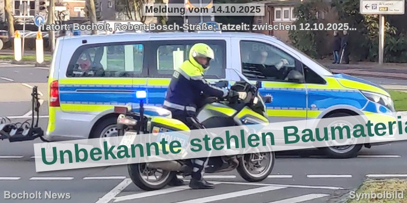 Tatort: Bocholt, Robert-Bosch-Straße;Tatzeit: zwischen 12.10.2025, 16.00 Uhr und 13.10.2025, 06.00 Uhr;Auf Baumaterialien abgesehen hatten es Unbekannte in der Nacht zum Montag in Bocholt. Die Täter verschafften sich durch beschädigen eines Zauns Zutritt zum Baustellengelände an der Robert-Bosch-Straße. Dort entwendeten sie neben Kupferkabel, auch Elektromotoren und Edelstahlbleche. Es entstand ein Schaden von circa 1000 Euro. Die Polizei sucht Zeugen. Hinweise bitte an die Kripo Bocholt, Tel. (02872) 2990. (jh)