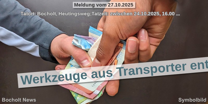 Tatort: Bocholt, Heutingsweg;Tatzeit: zwischen 24.10.2025, 16.00 Uhr und 27.10.2025, 06.10 Uhr;Werkzeuge aus einem Transporter gestohlen haben bislang unbekannte Täter in Bocholt auf dem Heutingsweg. Zwischen Freitagnachmittag und Montagmorgen machten sich die Unbekannten gewaltsam an dem Türschloss des Peugeot zu schaffen und entwendeten aus dem Innenraum Werkzeuge im Wert von mehreren tausend Euro.Die Polizei sucht Zeugen. Hinweise nimmt das Kriminalkommissariat in Bocholt unter Tel. (02871) 2990 entgegen. (sb)