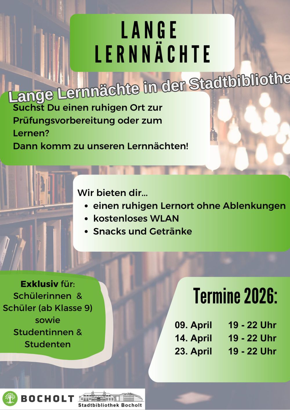 Längere Öffnungszeiten zur Vorbereitung auf Abschlussprüfungen und Klausuren....